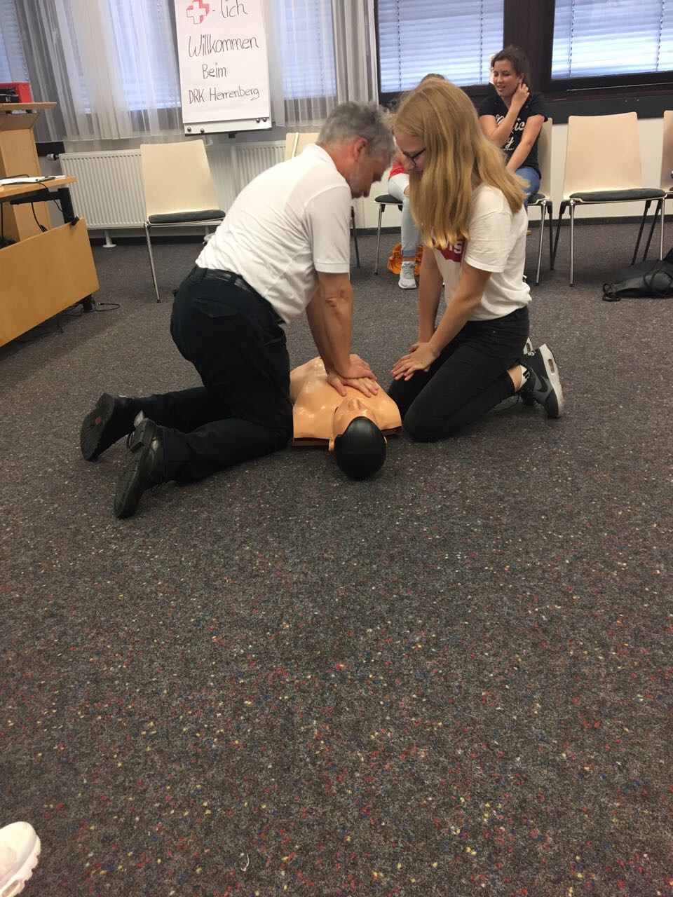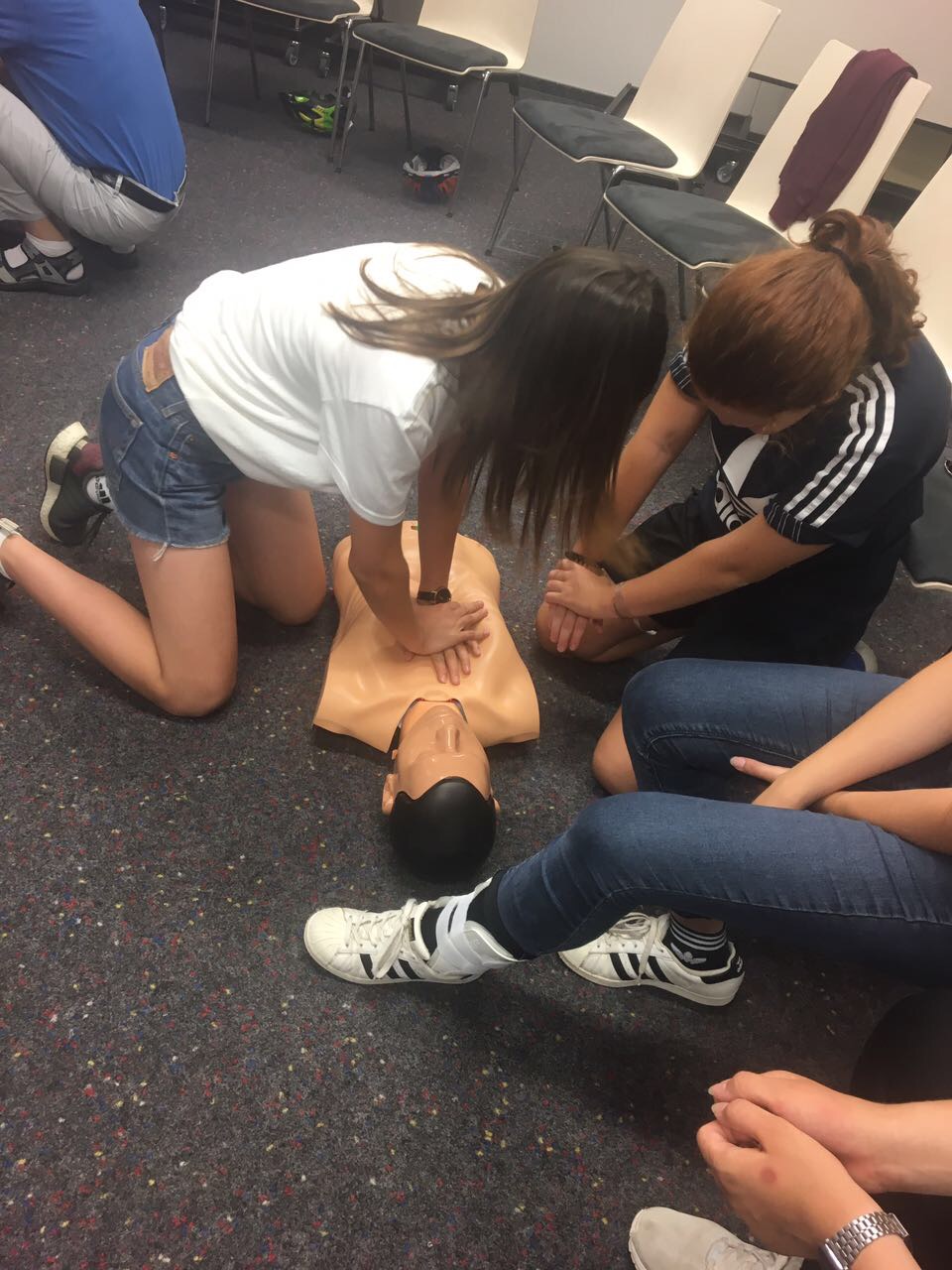 Die Organisatoren der „Prüfen, Rufen, Drücken“-Kampagne wollen bewusst Schüler und Jugendliche ansprechen und das Thema Reanimation anschaulich näher bringen. Unter der Leitung von Dr. Winfried Schürmann, Chefarzt für Anästhesie und Intensivmedizin des Herrenberger Krankenhauses, übten die Jugendlichen das Prüfen der Atmung, das richtige Absetzen des Notrufs und die Herzdruckmassage an Übungspuppen. Nach 60 Minuten fühlten sich die 14 Fußballerinnen gut aufgeklärt und ihnen wurde bewusst, dass drei Maßnahmen über Leben und Tod entscheiden: prüfen, rufen, drücken, bevor der Rettungsdienst eintrifft.